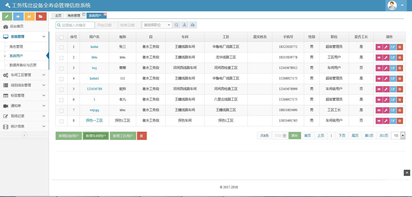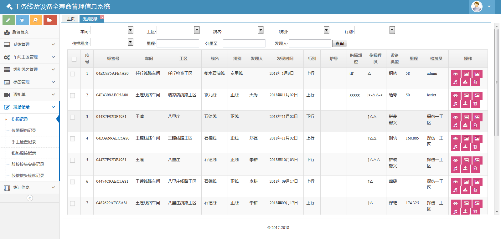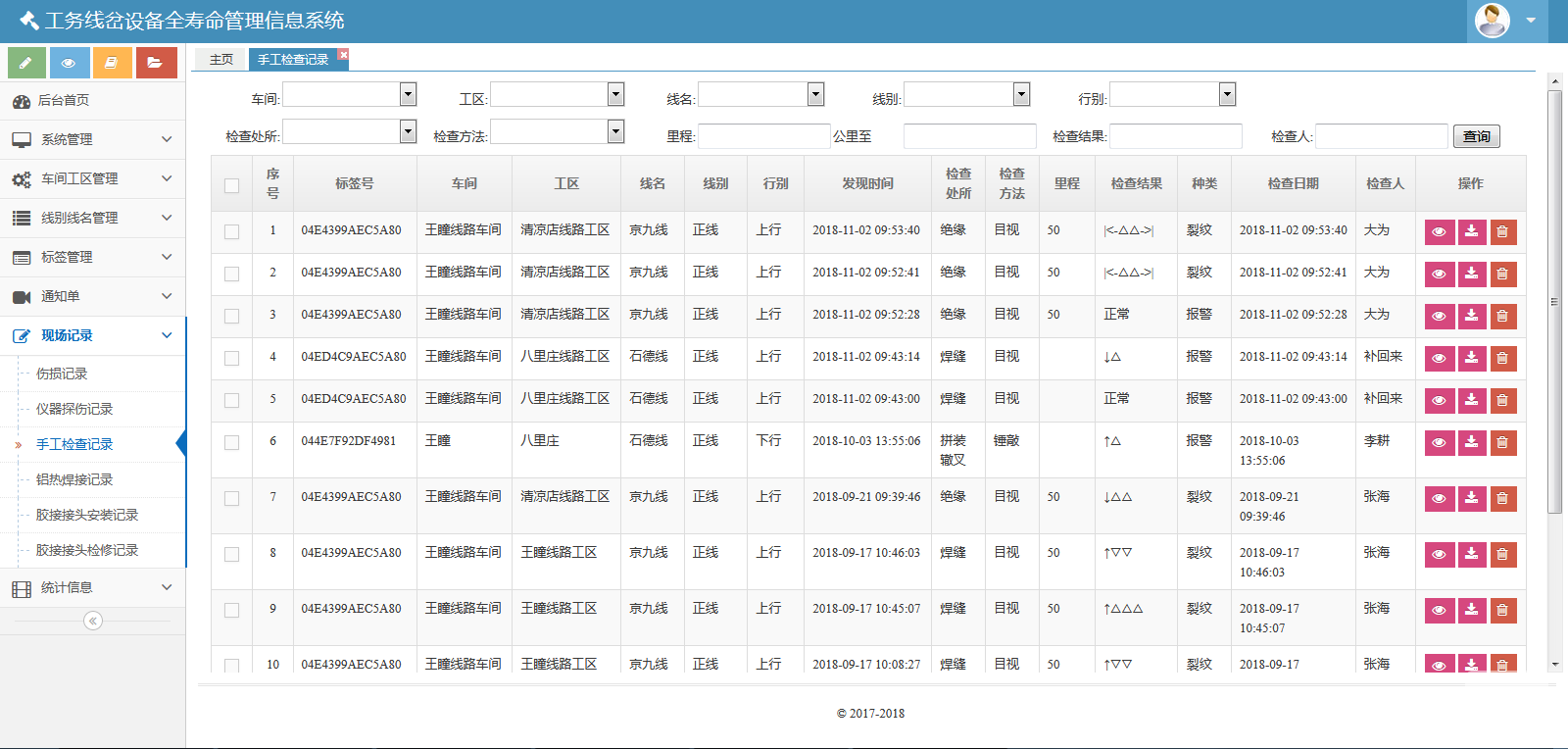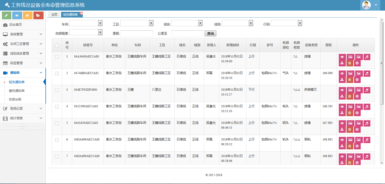 該系統包括七個模塊:系統管理、車間工區管理、線別線名管理、標簽管理、通知單、現場記錄和統計信息。該系統可以對數據庫進行備份與還原。可以管理用戶與角色。也可以管理車間、線名線別、標簽。可以生成并導出輕傷通知單、重傷通知單、傷損臺賬。也可以生成并維護、導出傷損記錄、儀器探傷記錄、手工檢查記錄、鋁熱焊接記錄、膠接接頭安裝記錄、膠接接頭檢修記錄。還可以按照工區、類型統計鐵路信息。