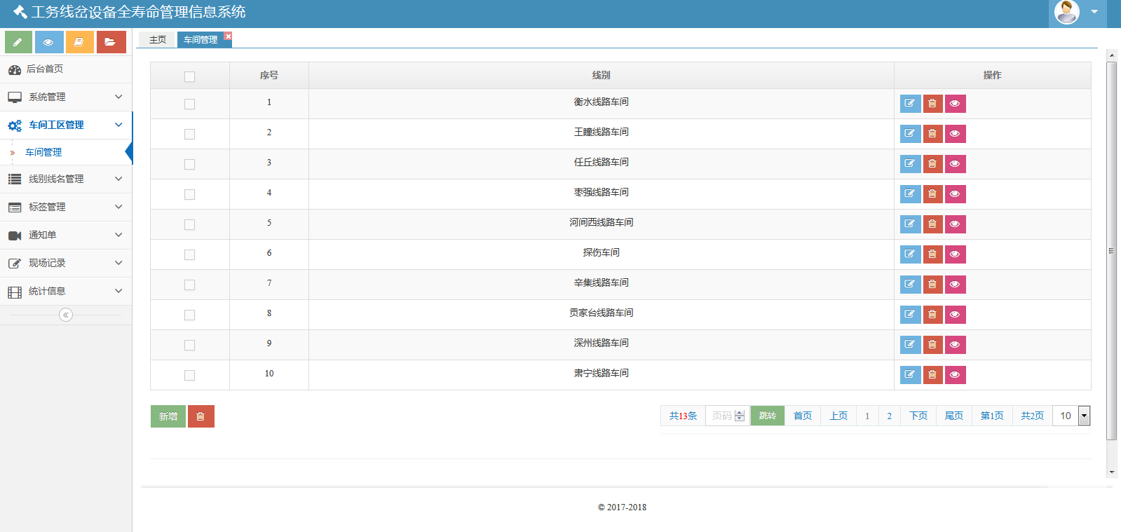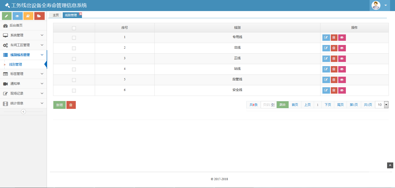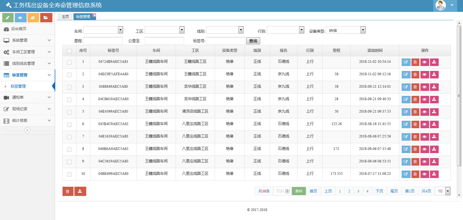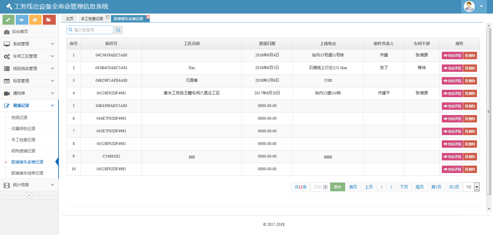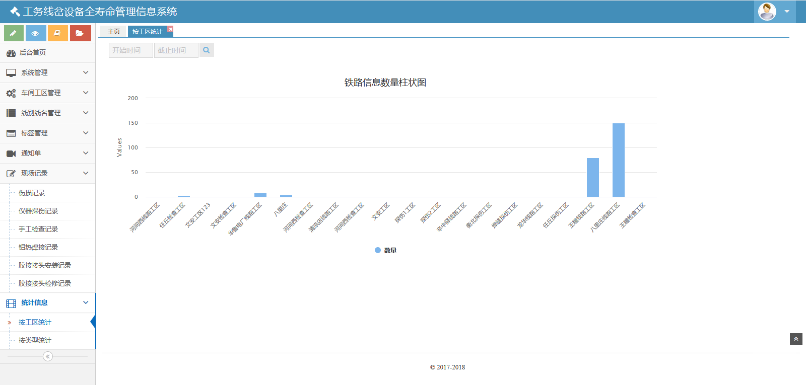 該系統包括七個模塊:系統管理、車間工區管理、線別線名管理、標簽管理、通知單、現場記錄和統計信息。該系統可以對數據庫進行備份與還原。可以管理用戶與角色。也可以管理車間、線名線別、標簽。可以生成并導出輕傷通知單、重傷通知單、傷損臺賬。也可以生成并維護、導出傷損記錄、儀器探傷記錄、手工檢查記錄、鋁熱焊接記錄、膠接接頭安裝記錄、膠接接頭檢修記錄。還可以按照工區、類型統計鐵路信息。